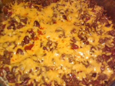 1. In a large skillet, brown ground beef over medium heat; drain well. Add beans, tomatoes with green chilies, 1 cup water, rice, and chili powder, stirring to combine.