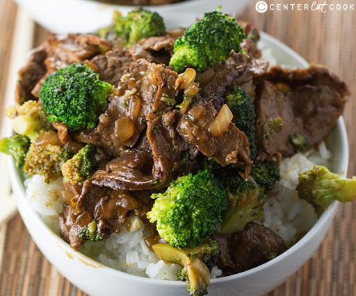 Slice marinated flank steak into very thin strips. In a small bowl whisk together 2 tablespoons corn starch, and 1/2 cup water. Toss beef in this mixture and allow to sit for about 5 minutes. Heat 1 tablespoon oil in a large non-stick skillet or wok (high heat), and stir fry beef for about 2 minutes, or until it is cooked through. Remove the beef from the pan and set aside. Add another tablespoon of oil to the pan, if needed, and stir fry onion, and broccoli for a few minutes. Add in garlic and cook a minute or two longer. While the broccoli is cooking, combine sauce ingredients – 1/3 cup soy sauce, brown sugar, ginger, and 1 tablespoon corn starch. Mix well. Add beef back into the pan with the broccoli, onions, and garlic. Reduce heat, and stir in sauce. Simmer for a few minutes, until it has thickened. Stir in chopped fresh cilantro. Adjust seasonings to taste and serve immediately over steamed rice.