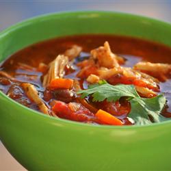 In a large pot over medium heat, cook onion and garlic in olive oil until slightly browned. Stir in salsa, diced tomatoes, whole tomatoes, tomato soup, chili powder, corn, chili beans, sour cream, shredded chicken and 5 cups broth. Simmer 30 minutes.