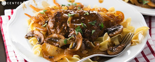 In a large bowl, combine ground beef with black pepper, salt, garlic powder, worcestershire sauce, garlic, bread crumbs and 1 large egg. Form into 4-6 oval or circular patties. In a large non-stick skillet, melt 2 tablespoons butter over medium high heat. Add the patties to the pan and cook for about 4 minutes, then flip and continue cooking until the patties are cooked through. Remove the patties from the pan, cover with foil and set aside. Drain off any excess grease in the pan. Over medium-low heat, add the onions and mushrooms to the pan and cook for 15-20 minutes, or until the mushrooms and onions are tender and golden brown. Sprinkle 2 tablespoons flour over the onions, stir, and allow the flour to cook for a minute or two, then stir in 1 tablespoon ketchup, 2 teaspoons Worcestershire sauce and 2 cups beef broth. Bring to a boil, then reduce heat to low. Add the Salisbury Steak patties back to the pan and simmer for about 15 minutes, or until the gravy has thickened. Serve over egg noodles.