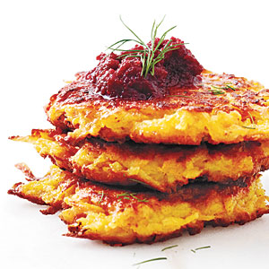 Crispy Root Vegetable Latkes with Beet Purée