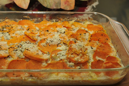 Layer ⅓ of the sweet potato slices (slightly overlapping each other) in the pan. Sprinkle them with salt and pepper, then top with ⅓ of the onion, garlic, cheese, and fresh herbs.