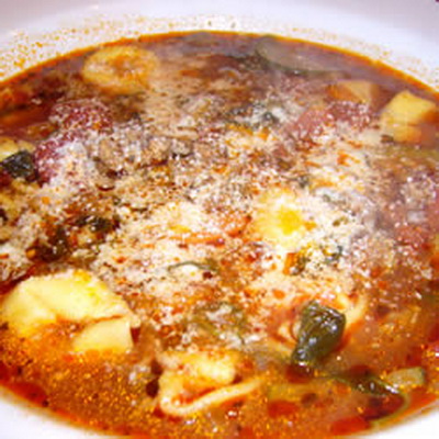 Italian sausage, garlic, tomatoes, red wine, and tortellini - this soup combines favorite ingredients from an Italian kitchen. You can use sweet or hot sausage, depending on your tastes, and fresh herbs if you have them on hand.
