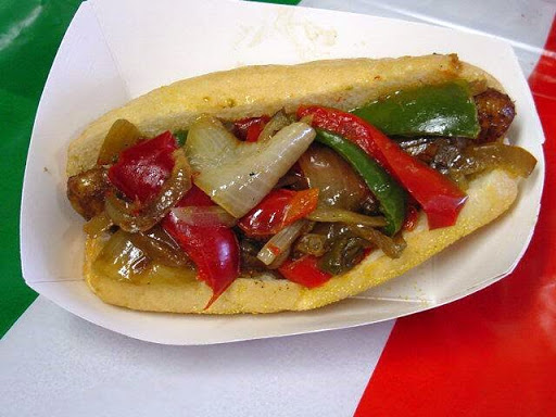 Brown sausage and then simmer in tomato sauce for several hours. Saute peppers and onions in a little olive oil. Serve sausage and sauce in rolls with peppers and onions.