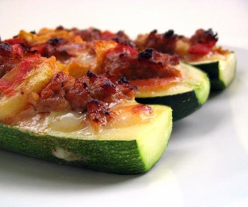 Parboil zucchini for about 10 minutes. Cut in half lengthwise and scoop out center pulp. Saute onion, zucchini and garlic in olive oil. Add tomatoes and Italian seasoning, simmer for 10 minutes. Add breadcrumbs and parmesan until looks like oatmeal. Brush zucchini shells with butter, add zucchini stuffing and drizzle with the rest of the butter. Bake at 400 for about 20 minutes, broil at the end to brown.