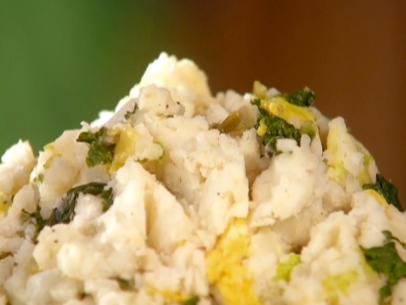 Melt the remaining butter in a large pot over medium heat. Add shallots and leeks. Saute until they begin to soften. Add the kale and toss until soft and wilted but still bright green, about 3 minutes. Add the cabbage and toss until tender-crisp, about 8 minutes. Sprinkle with nutmeg, salt and the remaining pepper.