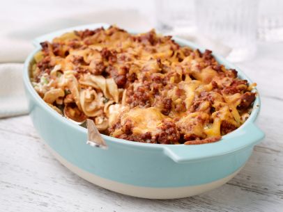 To assemble, add half of the noodles to a baking dish. Top with half the meat mixture, and then sprinkle on half the grated Cheddar. Repeat with noodles, meat and then a final layer of cheese. Bake until all the cheese is melted, about 20 minutes.