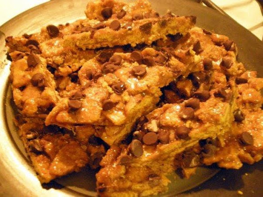 3. Stir broken crackers into marshmallow mixture to coat evenly. Spread mixture into a lightly greased pan (13 x 9 x 2inch); sprinkle with cholcolate chips, pressing chips lightly with greased hands.