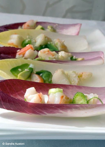 Just before serving, cut the avocado into ¼-inch cubes, and fold into the shrimp mixture. Add the chopped cilantro. Separate the endive leaves, and arrange 24 on a platter. Spoon about 1 teaspoon onto each leaf. Garnish with sliced scallions and sesame seeds.