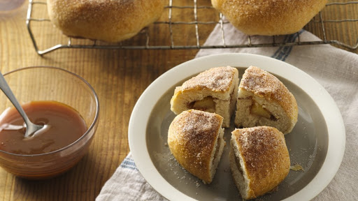 Pillsbury® Grands!® refrigerated biscuits are wrapped around apple slices for baked doughnuts with a surprise fruity center.
