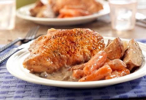 Chicken and vegetables roast together in a creamy and savory gravy to make a dish that's easy, hearty and delicious.
