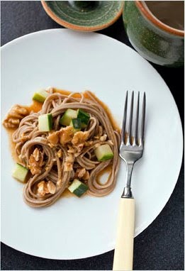 Advance preparation: You can cook the noodles up to three days ahead. Toss them with 2 teaspoons of the canola oil, and refrigerate. The noodles may be cooked several hours ahead, tossed with the dressing and held at room temperature. Toss with the cucumber, cilantro and walnuts shortly before serving.