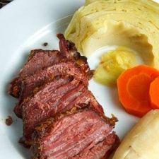 Serve the corned beef next to the cabbage and roasted vegetables and enjoy!