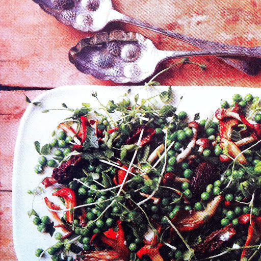 Add butter to a lg. skillet over med-high heat; let it melt & foam. Add mushrooms, season with salt, pepper & cayenne, & cook about 3 min. Add cognac, cook till almost dry, then add cream. Stir together, then reduce to a sauce-like consistency . Add peas & lemon juice, & stir till warmed through. Taste for seasoning, add parsley & pour into a shallow bowl. Top with 1 1/2 C. pea shoots & stir till shoots just start to wilt. Garnish with remaining 1/2 C. fresh shoots to serve.
