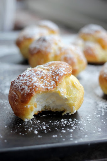 Fill cooled pastries with creme chantilly (recipe follows) and dust with powdered sugar.