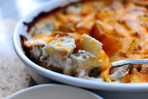 Preheat oven to 400 degrees. Smear softened butter all over the bottom of a baking dish. Slice potatoes, then cut slices into fourths. In a separate bowl, whisk together cream, milk, flour, minced garlic, salt, and plenty of freshly ground black pepper. Place 1/3 of the potatoes in the bottom of the baking dish. Pour 1/3 of the cream mixture over the potatoes. Repeat this two more times, ending with the cream mixture. Cover with foil and bake for 30 minutes. Remove foil and bake for 20 minutes, or until potatoes are golden brown and really bubbling. Add grated cheese to the top of the potatoes and bake for 3 to 5 more minutes, until cheese is melted and bubbly. Allow to stand for a few minutes before serving by the spoonful. Delicious!