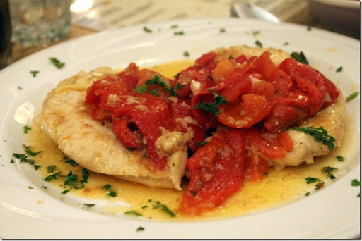 Grill chicken breasts 3 minutes on each side. Place aside. In 18 inch non-stick frying pan, add olive oil and garlic. When garlic is golden color, add diced tomatoes, basil leaves, roasted peppers, salt, black pepper. Saute for 5 to 7 minutes on medium flame. Place chicken breast on top of ingredients in frying pan, deglaze with cup of sauterne wine. Top with provolone cheese and simmer for 3 additional minutes with a lid on top.