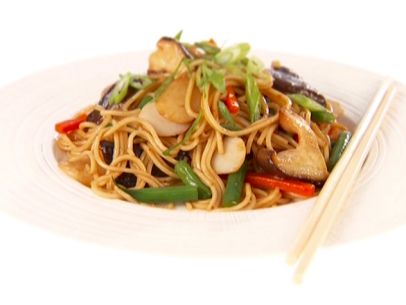 In a large nonstick skillet, heat the oil over high heat. Add the noodles, ginger and garlic. Cook for 2 minutes until the noodles are lightly browned. Add the mushrooms, beans, carrots, and water chestnuts and cook for 3 minutes. Add the broth, hoisin sauce, soy sauce, and honey. Bring the mixture to a boil and stir until slightly reduced and thick, about 2 minutes. Season with salt and pepper, to taste.
