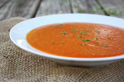 5. Transfer all roasted ingredients to a food processor or blender. Add one cup of broth. Puree on medium until fairly smooth. Add as much or as little of the additional broth until you reach a desired consistency. You might have to work in batches, depending on the size of your equipment.