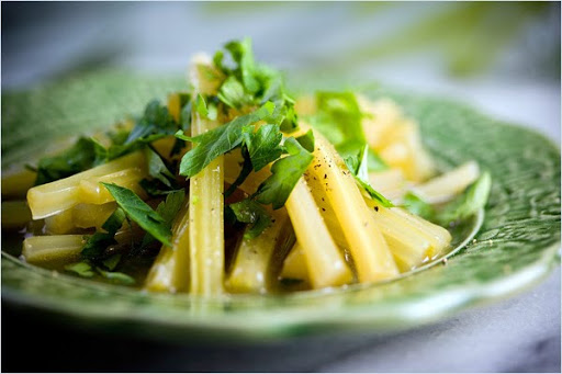 1. Preheat the oven to 400F. Bring a large pot of generously salted water to a boil and drop in the celery. Boil until partially cooked, about 3 minutes. Drain, pat dry and lay side by side, cut side up, in a baking dish.