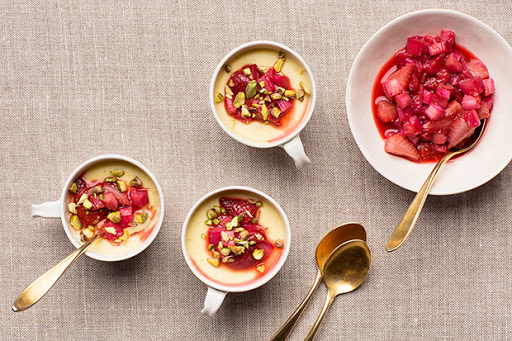 To serve, top custards with strawberry-rhubarb compote and sprinkle with pistachios.