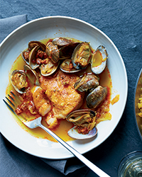 Transfer the fish to shallow bowls. Spoon the clams, chorizo and broth around the fish and serve with Paella Rice.