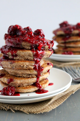 Feast on these amazing banana buckwheat pancakes from The Wheatless Kitchen! Each nutty pancake has chunks of sweet banana and is topped with an irresistible blackberry compote. Buckwheat flour is a great gluten-free option plus it makes for dense pancakes so if you prefer lighter pancakes mix buckwheat flour with another flour of your choice.