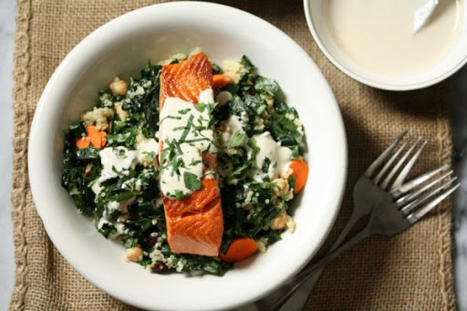 QUINOA-Salmon and Quinoa Bowls with Kale and Tahini-Yogurt Sauce