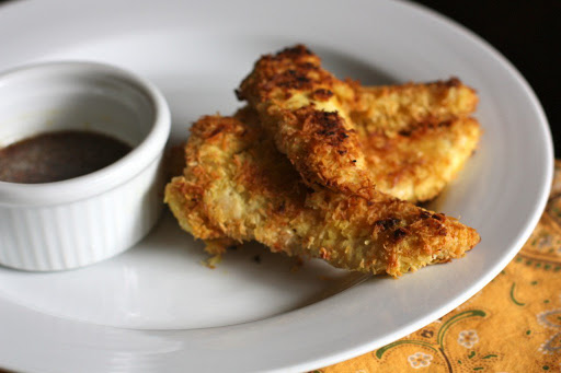 6. Place the chicken strips on prepared baking sheet. Bake for 10 minutes, then turn the chicken over and bake another 10 minutes.