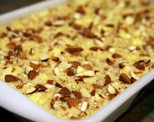 Pour the egg-and-milk mixture over the top of the fruit and quinoa. Lightly stir to partially submerge the fruit. Sprinkle the chopped almonds on top.