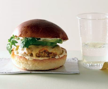 Spread buns with mayonnaise and assemble burgers with tomatillo, avocado, and cilantro.