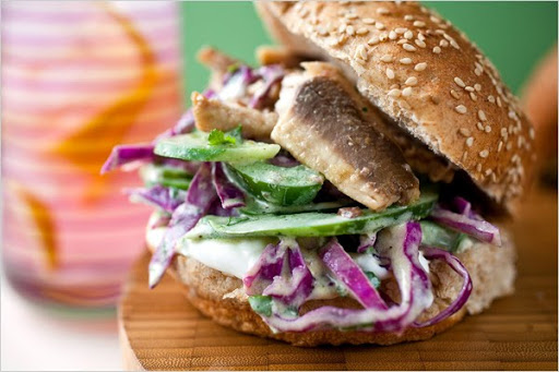 3. Drain the cabbage, and toss with the bell pepper and parsley. Mix together the vinegar, mustard, 1 tablespoon of the garlic yogurt and the olive oil, and combine well. Toss with the cabbage mixture. Add salt and pepper to taste. Pile the coleslaw onto the bottom half of the bun, and push down. Top with the sardine fillets. Spread the top bun with the remaining garlic yogurt, and place over the sardines. Press down, and wrap the sandwich tightly in plastic wrap. Allow to sit for 10 to 15 minutes, or for several hours in the refrigerator, before eating.