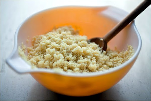 • to a tablespoon or two of olive oil, rubbing the couscous between your fingers to distribute the oil throughout.