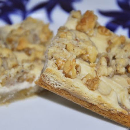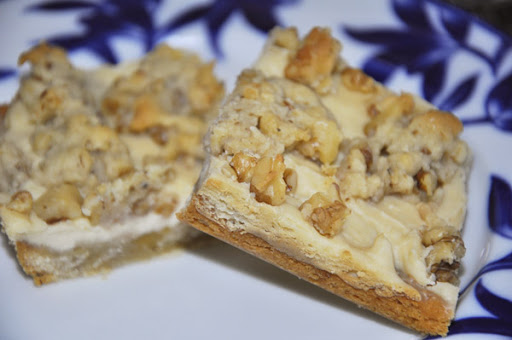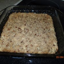 Make Crust: Cream butter and honey, Add flour and walnuts and mix until it forms crumbs. Set aside 1 cup for the topping. Press the remaining crumbs into a greased 8 inch pan. Bake at 350º 15-20 minutes or until lightly browned.