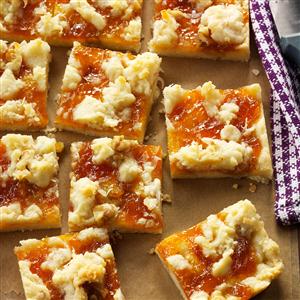 Press two-thirds of dough onto the bottom of a greased 13x9-inch baking pan. Spread with preserves; crumble remaining dough over preserves. Bake 30 to 35 minutes or until golden brown. Cool completely in pan on a wire rack. Cut into bars.