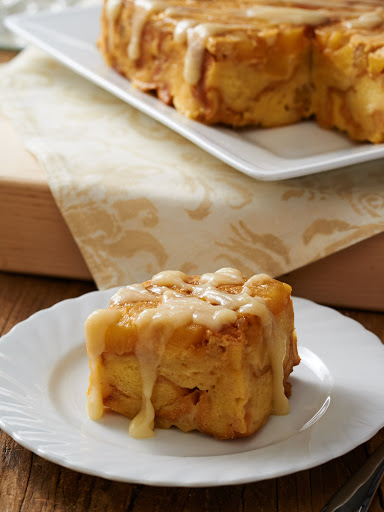 After 15 minutes, unmold the bread pudding onto a serving platter, drizzle it with the glaze, and serve immediately.