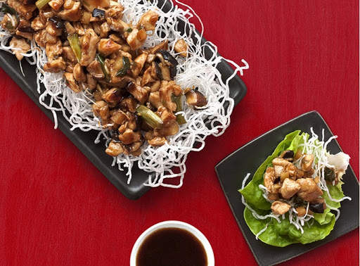 Make a bed of noodles on a platter and top with the chicken mixture. Serve the noodles and stir-fry with lettuce leaves and soy sauce for dipping.