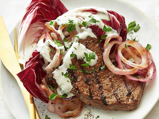 5. Arrange onions on serving plate and top with steak. Drizzle with blue cheese sauce. Serve immediately.
