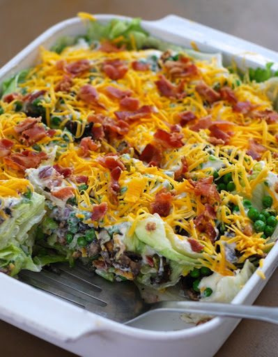 Remove core from head of lettuce. Cut head into quarters. Carefully separate the lettuce layers. Put half of them in the bottom of a 9 x 13, glass cake pan. Top with half of the onion, half of the celery, half of the green pepper, half of the mushrooms, and half of the frozen (thawed) peas. Combine the mayo with the sugar. Spread half of the mayo mixture over the salad. Top with half of the cheese and half of the bacon. Repeat with another salad layer, starting with lettuce and ending with bacon. Cover cake pan tightly with foil. Place in refrigerator and chill for at least 12 hours and up to 24 hours. Cut into 8 to 12 square pieces. Salt and pepper to taste. Serve.