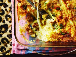 Grease a baking dish with 1 tablespoon butter. Lay down half the potato mixture and a layer of smoked scamorza. Top off with the remaining potato mixture, small pats of the remaining 2 tablespoons butter and sprinkle with the breadcrumbs. Bake until the crust is golden, about 30 minutes.