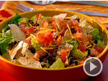 Nutritional analysis per serving (Serving size: 2 cups lettuce, 1 cup beef mixture, 2 tablespoons cheese, 3/4 cup of tomato mixture, and about 8 crushed tortilla chips)