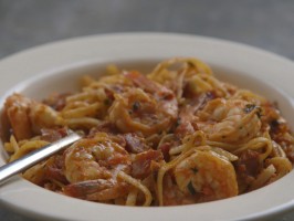 Drain the pasta and add it back in the same large pot. Add the sauce and shrimp and mix everything together so that every strand of linguine is coated in that spicy sauce!