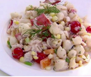 Bring a large pot of water to a boil and add 2 tablespoons of salt and some olive oil. Add the pasta and cook it for 8 to 10 minutes, until al dente. Add the corn to the pasta and cook it for another 2 minutes, until the corn is tender. Drain the pasta and corn together in a colander and pour them into a large mixing bowl. Add the scallions, diced pepper, tomatoes, and lobster, tossing gently to combine. Allow to cool slightly.