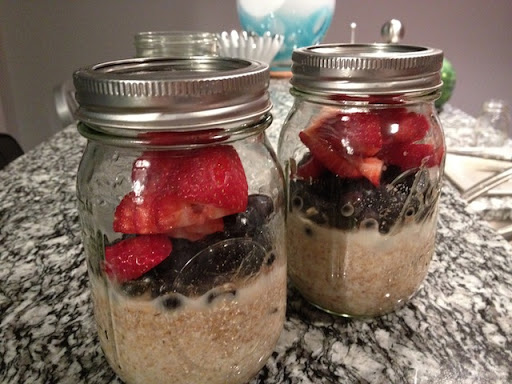 In a "to go" glass container of your choice: Place oat groats, ezekiel cereal/oats, cinnamon, currants, chia seeds, and almond milk in the container and stir