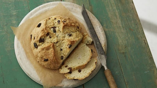 2) Cut butter into flour, sugar, baking soda, baking powder and salt in large bowl, using pastry blender or crisscrossing 2 knives, until mixture resembles fine crumbs. Stir in raisins and just enough buttermilk so dough leaves side of bowl.
