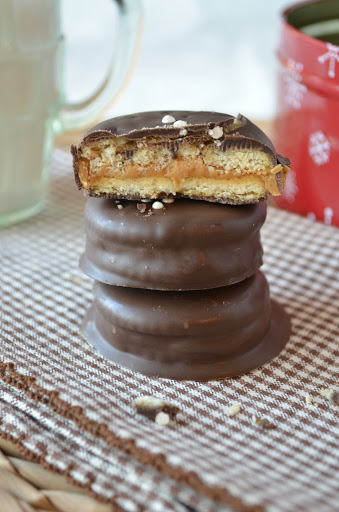 First, make peanut butter and Ritz sandwiches, using almost 2 Tbsp of peanut butter in each sandwich.