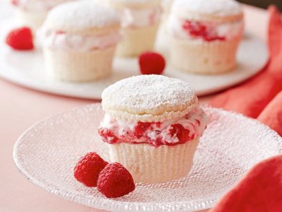 Remove the muffin papers from the cupcakes and cut the tops off of each cupcake. Spoon the raspberry whipped cream atop the cupcake bottoms. Place the cupcake tops on the cupcakes. Dust with more powdered sugar and serve with the remaining berries.