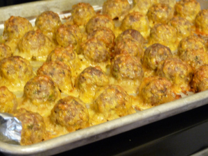 Mix all the ingredients together until thoroughly blended (it is best to use your hands or an electric mixer). Form into about 4 dozen 1 to 1 1/2 inch balls and place on a cookie sheet or broiler pan. Bake at 375 degrees for about 25 minutes. Once they are cool, they can be sorted into individual zip bags and frozen for a grab–and–go breakfast. NOTE: for Scotch Eggs, mold a bit of raw meat mixture around a peeled hard–boiled egg (or eggs) and bake at 350 degrees for 30 minutes.