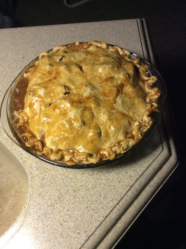 Mix all dry ingredients and toss with apples and spread over pie crust. Add 1/4 cup butter cut into small cubes and spread around apple mixture and cover with top pie crust.