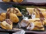 4. Fry egg rolls 4 at a time, turning almost immediately, cooking on all sides to just golden brown, less than a minute. (Make sure not to overcook filling. If you see marshmallows start to ooze out before both sides are golden, filling will be overcooked and egg roll will appear hollow inside) Remove to a paper towel-lined plate and repeat until all cooked. Make sure to check your oil temperature between additions.